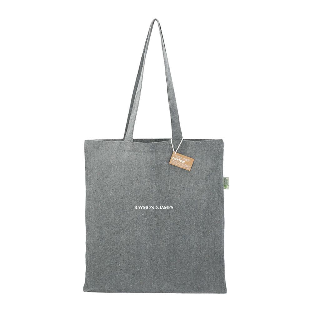Contains recycled cotton collected from garment cutting waste blended with recycled polyester to produce a strong reusable bag. Bag weight is 180g. Features your logo printed on the front. 15H x 16.5W