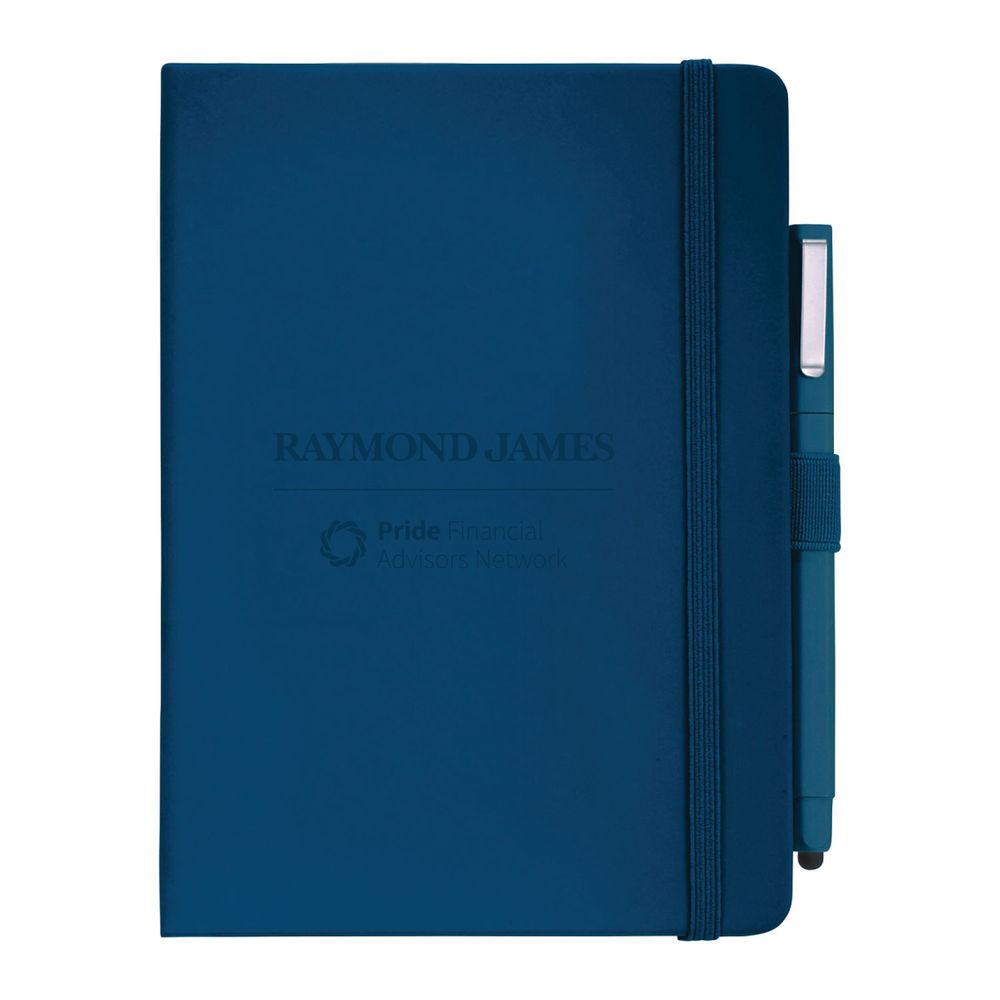Set includes a hard bound journal and ballpoint stylus. Soft touch, hard cover bound journal with built in elastic closure. Color matching elastic pen loop and ribbon page marker. Includes 72 sheets of white lined paper. Features the Raymond James logo and the Pride Financial Advisors Network logo.