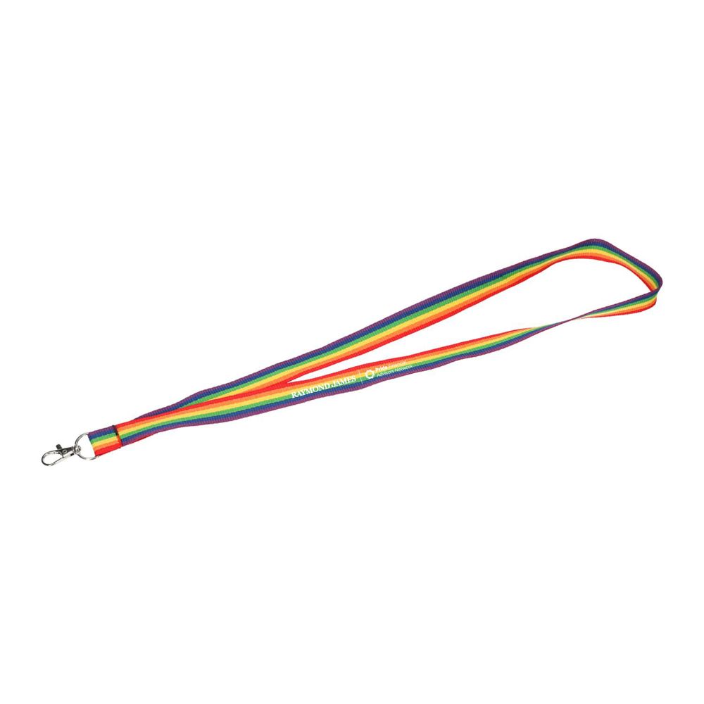 The Recycled Polyester Rainbow Lanyard is a great sustainable option to show off your pride support! This lanyard measures .75" wide and 19" long using recycled polyester and has a lobster clip. The colors include red, orange, yellow, green, blue and purple and may vary in pattern. Features the Raymond James logo and the Pride Financial Advisors Network logo.