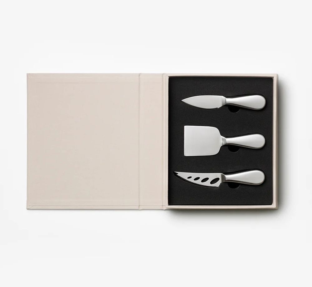 Introducing the essential kit for your cheese board - a refined toolbox in an elegant book-like box that makes the perfect going-away gift. Inside, you'll find three knives suitable for your favorite cheese varieties. From soft Brie to crumbly Blue Cheese and robust Parmesan, we've got you covered. All products are made of stainless steel and are dishwasher safe.